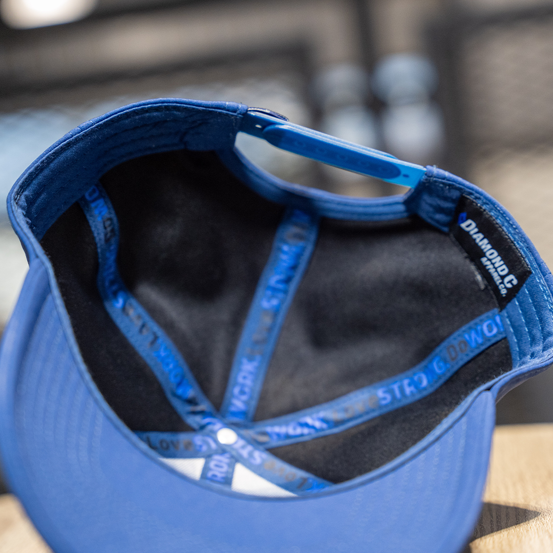 Athletic style meets Diamond C grit in this blue sport hat with a raised PVC logo and signature “Do Work. Love Strong.” inseam detail.